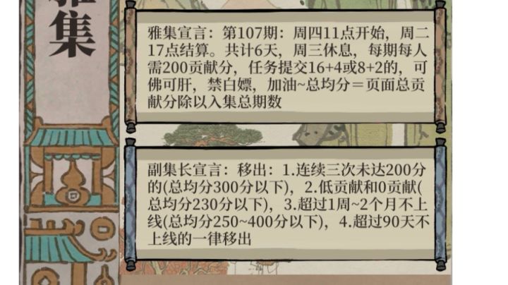 十一级雅集招人C3XXV3XEZ进入雅集第一时间交满五次贡献。希望一直会玩下去的人加入。宣言每天会更改,记得看一眼。不收白嫖,大家都在贡献,没道理白嫖拿奖励。三天内两天不交就踢。 冷却期可先进群。球球啦,好缺人可以一起约桃花村组队,入股不亏!!#雅集#桃花村#江南百景图