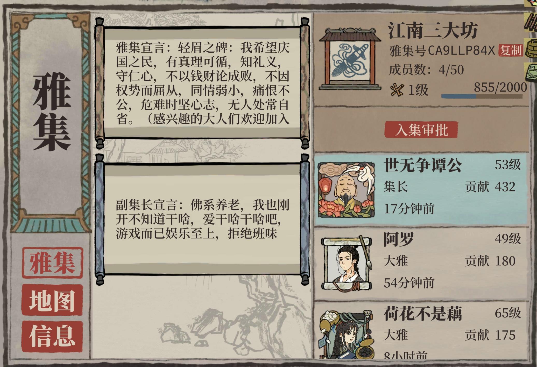 招募可以进雅集的友友,招募25级以上,招募每周能贡献200分以上的成员,具体看雅集宣言,招募可以长期的,较为稳定和积极的知府大人,雅集概况和福利可以看帖内。(自由加入,人满即止)进来的uu看一下贡献技巧小攻略,首选16+4和8+2的贡献分任务,经常点互助,签到领木椽。雅集非常稳定!欢迎加入!注意注意:退雅集有24h冷却时间,刚退的友友等24h之后再申请入集雅集号C48YQSLVY(复制找2