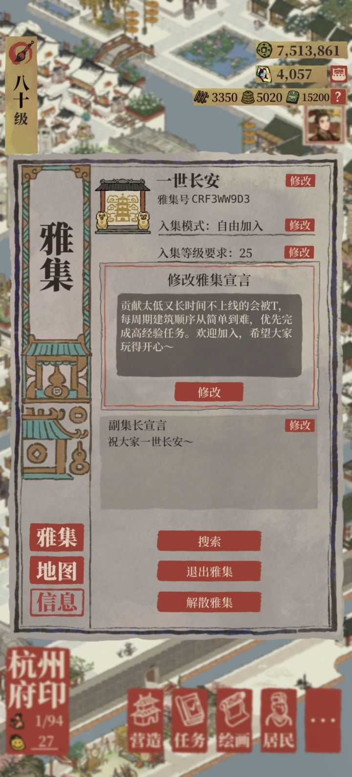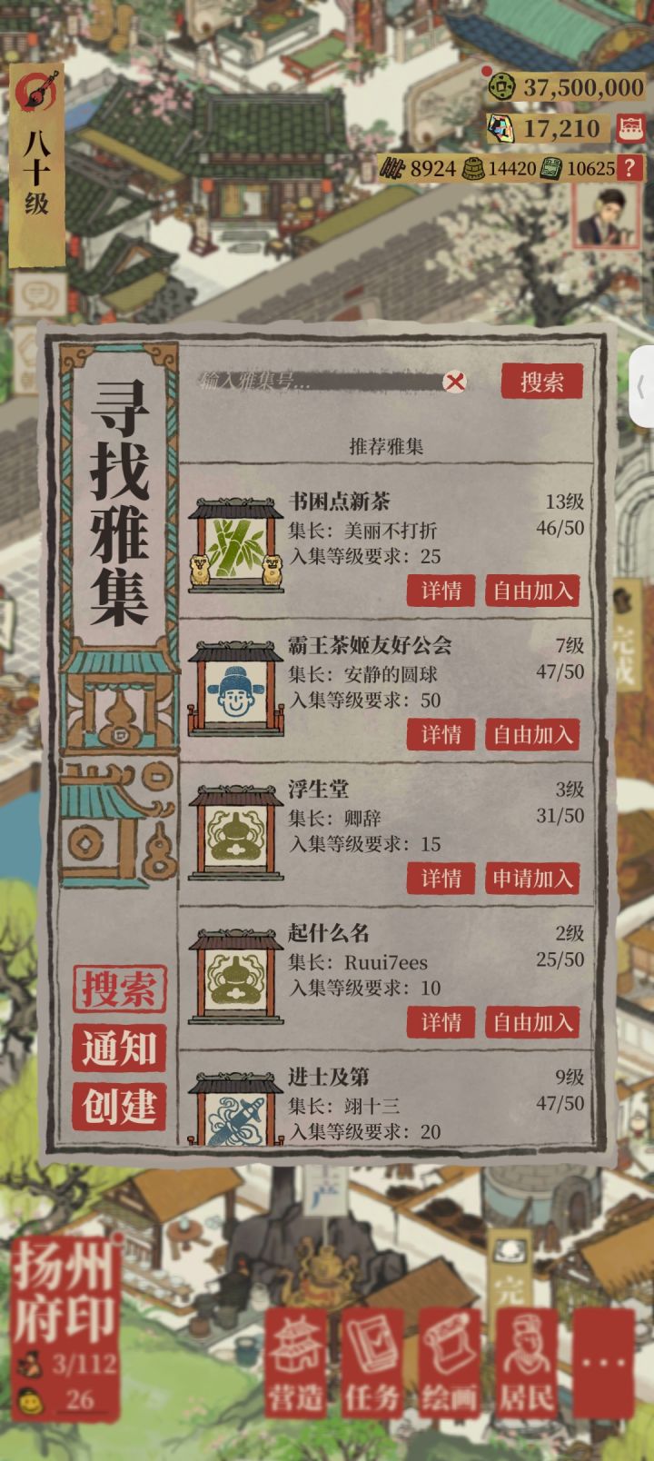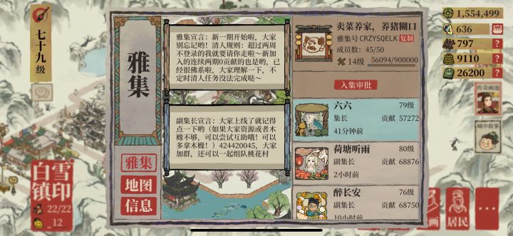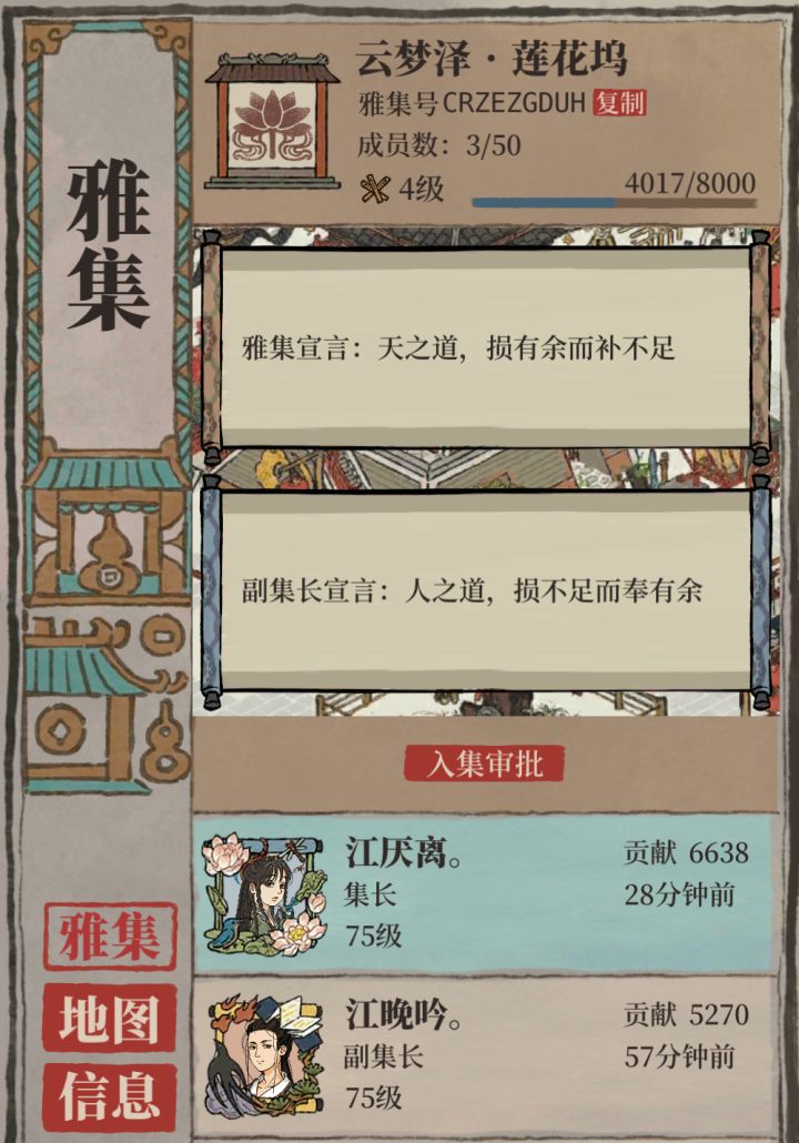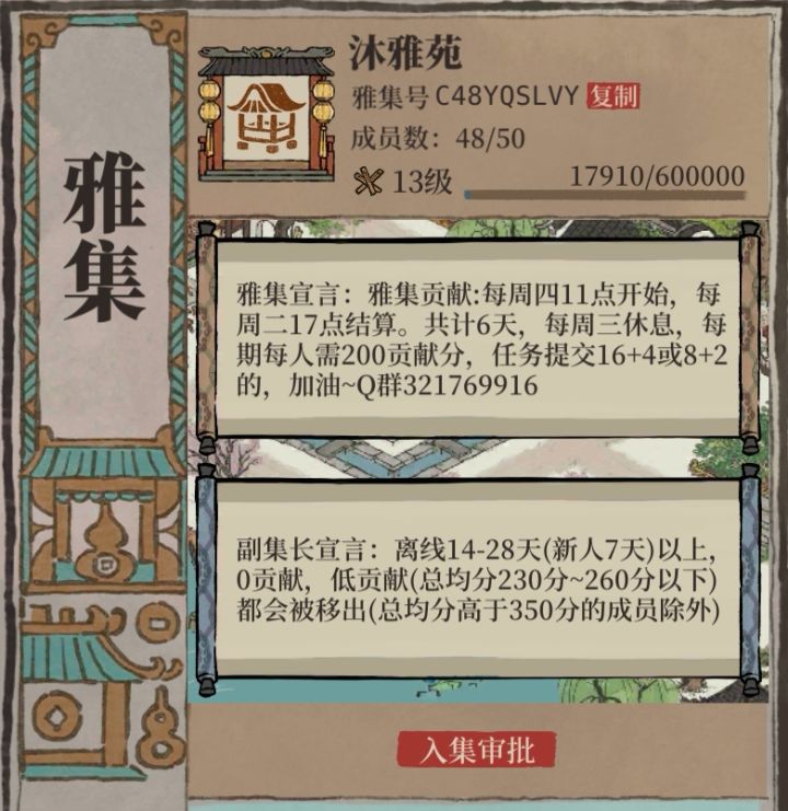 招募可以进雅集的友友,招募25级以上,招募每周能贡献200分以上的成员,具体看雅集宣言,招募可以长期的,较为稳定和积极的知府大人,雅集概况和福利可以看帖内。(自由加入,人满即止)进来的uu看一下贡献技巧小攻略,首选16+4和8+2的贡献分任务,经常点互助,签到领木椽。雅集非常稳定!欢迎加入!注意注意:退雅集有24h冷却时间,刚退的友友等24h之后再申请入集雅集号C48YQSLVY(复制找2