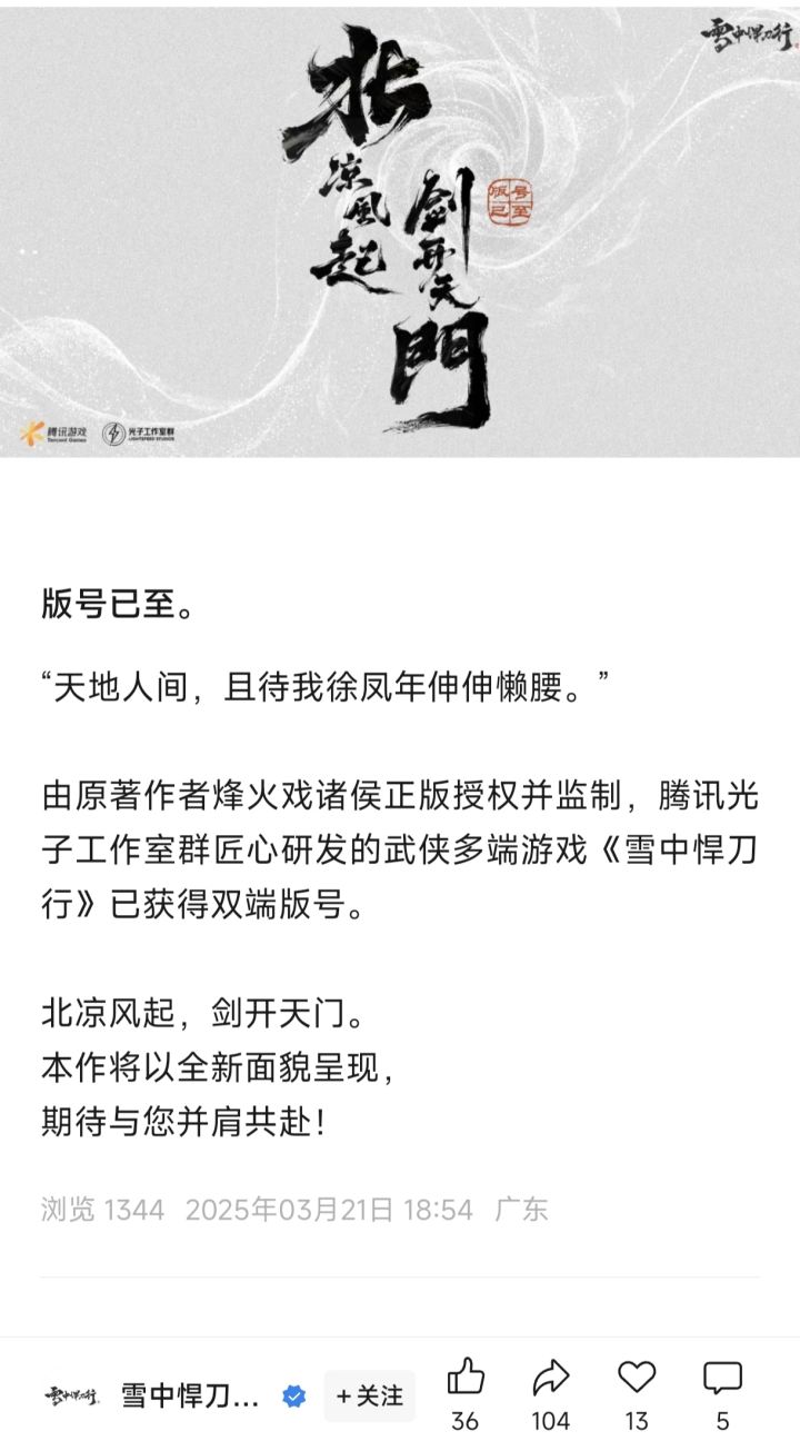 2025年3月21日,沉寂了许久的《雪中悍刀行》官方终于有了动静,并宣布版号已至。——版号已至。“天地人间,且待我徐凤年伸伸懒腰。”由原著作者烽火戏诸侯正版授权并监制,腾讯光子工作室群匠心研发的武侠多端游戏《雪中悍刀行》已获得双端版号。北凉风起,剑开天门。本作将以全新面貌呈现,期待与您并肩共赴!#今天游戏圈发生了啥 #雪中悍刀行 #徐凤年