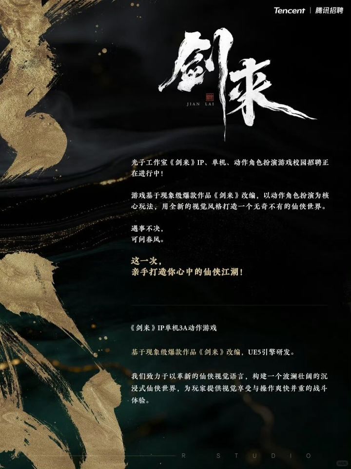 腾讯旗下光子工作室群——光子R工作室(R Studio)发布了2026年校园招聘信息,宣布将面向两款重磅3A新作开放招聘岗位。这两款游戏分别改编自现象级网文IP《雪中悍刀行》与《剑来》,涵盖了目前市场上备受关注的“搜打撤”玩法以及3A级别仙侠单机动作领域。《雪中悍刀行》:作为光子R工作室重点打造的项目之一,《雪中悍刀行》定位为3A级双端(PC/移动)武侠动作“夺金撤离”游戏。该作基于同名现象级