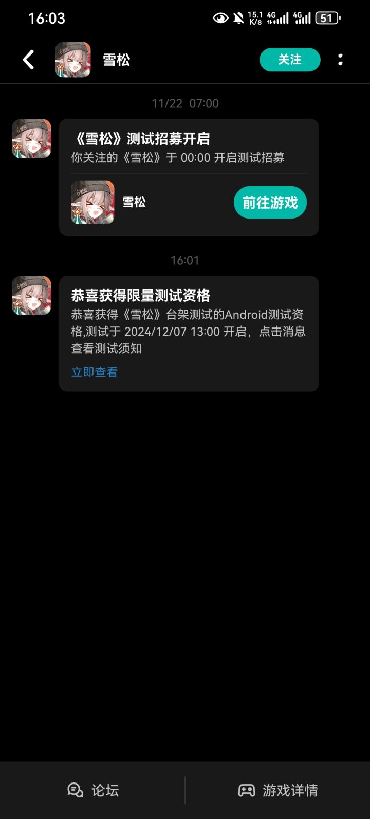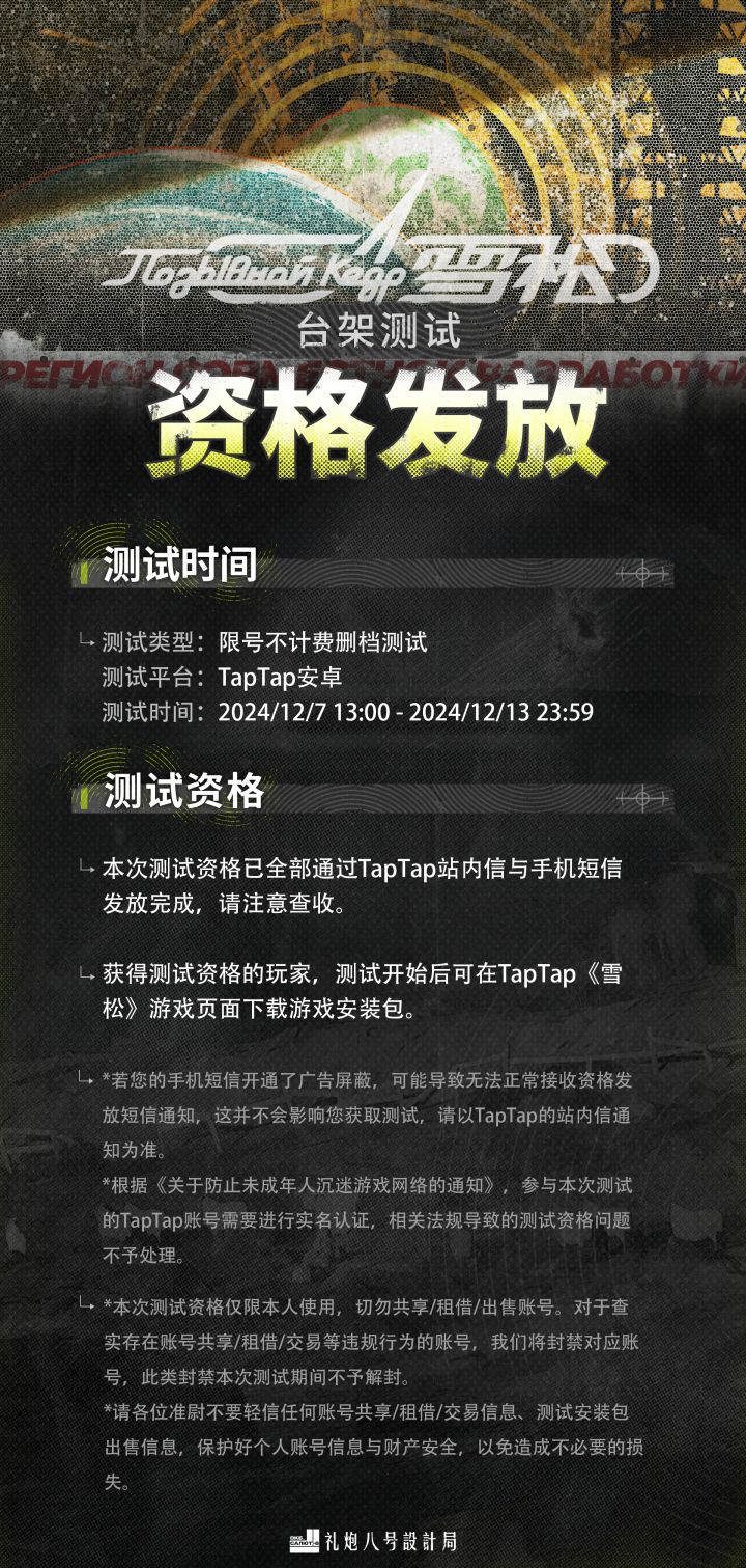 #雪松 #雪松台架测试 《雪松》台架测试资格已发放,请准尉同志注意查收!★关于测试★测试类型:限号不计费删档测试测试平台:TapTap安卓测试时间:2024年12月7日13:00 - 2024年12月13号23:59★资格发放★本次测试资格已全部通过TapTap站内信与手机短信发放完成,请注意查收。★注意事项★由于手机短信通知可能会被作为广告信息屏蔽,请以收到的TapTap站内信
