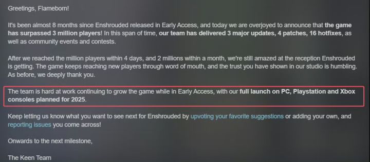 你不赞,我不赞,灵雪就会火的慢!关注一下呗~~~~~~ 游戏名:雾锁王国 (Enshrouded) 平台:Steam 售价:98元,更新八折78.4元(11月24日截止) 简介:你是火之子,一个濒死种族最后的希望火苗。苏醒吧,克服腐化一切的迷雾所裹挟的恐怖,重新夺回你的王国所失落的瑰丽。置身于广袤世界,战胜难以想象的强大Boss,修造宏伟厅堂,在这款至多16名玩家的合作类生存动作RPG中开辟属于自