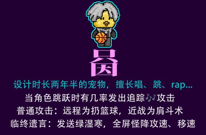 当角色跳跃时有几率发出追踪音符攻击普通攻击:远程为扔篮球,近战为肩斗术临终遗言:发送绿湿寒,全屏怪降攻速、移速#霓虹宠物共创计划#霓虹深渊无限#霓虹深渊#霓虹深渊宠物共创计划