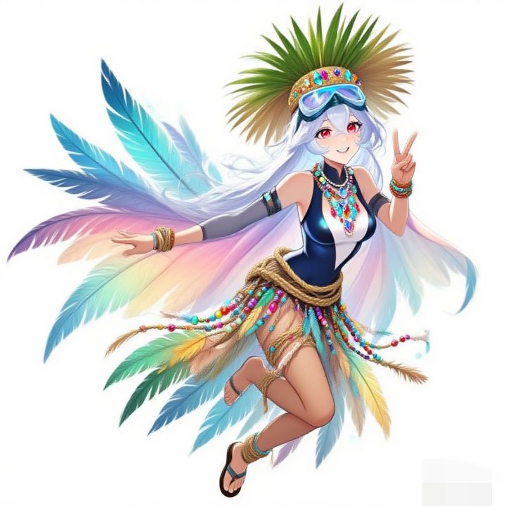 ID:102521#露奈尔ootd 我将为露奈尔设计一套极具波西米亚与奇幻元素融合的海岛穿搭。在潜水员泳装外,披上一件由羽毛和薄纱交织而成的披风,颜色如同绚丽的晚霞。搭配一条用椰壳和彩色羽毛串成的长裙,灵动又充满风情。头戴一顶棕榈叶编制并点缀着彩色宝石的帽子,脖子上挂着一串由贝壳和水晶组成的多层项链,手腕佩戴着几个用鱼骨和丝线缠绕的手环,脚穿一双麻绳编织且带有彩色珠子装饰的凉鞋。#