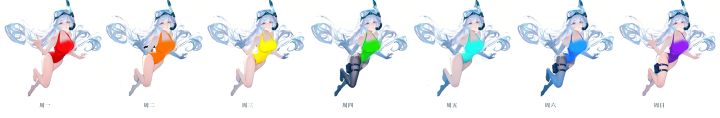 #露奈尔OOTD #露奈尔ootd 【搭配名称】:热带幻梦度假装【搭配描述/搭配图】:- 服装:以露腰短款吊带连体裤为主,底色为深邃蓝,融入渐变的浅蓝海浪纹,侧边拼接粉紫条纹,呼应角色原设定色彩。裤腿做高开叉设计,行走间露出肌肤,适配海岛 breeze ,后背保留轻薄仿生翼轮廓,半透明材质印着海洋生物暗纹,保留奇幻感又添度假松弛。- 配饰:- 保留原角色潜水镜,改做渐变蓝透明材
