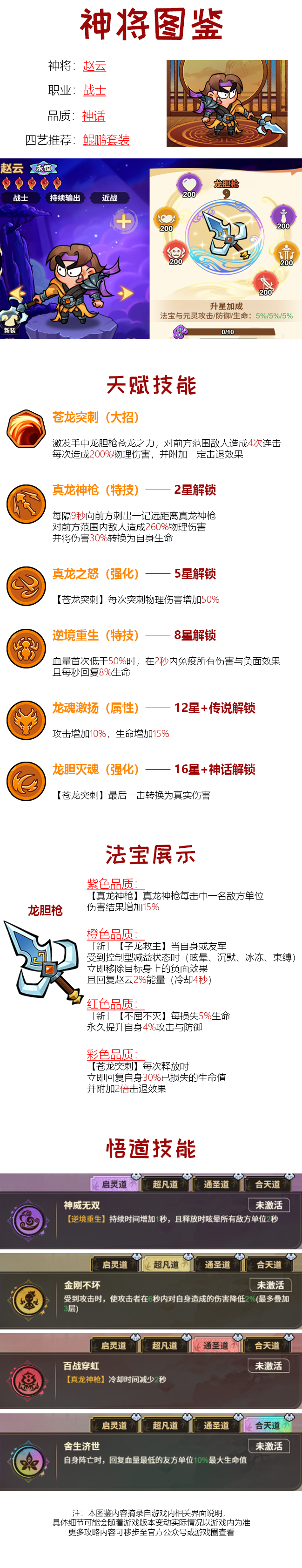 #非凡仙途赵云 【战区:131】【账号:20286658】【昵称:白乌鸦】赵云作为神话品质的战士神将,定位为持续输出型近战角色,核心优势在于高额的物理连击伤害、自我续航与生存保命能力,搭配鲲鹏套装能进一步放大其输出与生存的综合实力,是团队中兼具输出与坦度的核心战力。核心技能解析1. 苍龙突刺(大招):核心输出技能,对前方范围敌人造成4次连击,每次200%物理伤害并附带击退。5星解锁的真