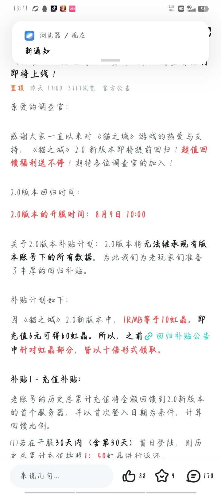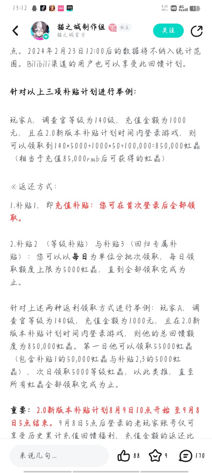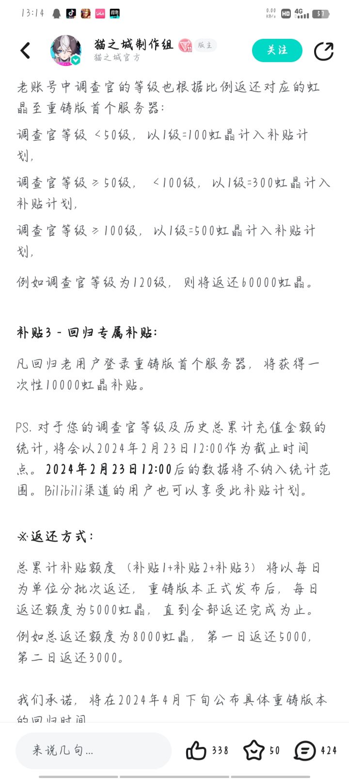 好吧,经过了挺长时间的销声匿迹,猫之城终于重制上线2.0版本了。 之前猫之城挺久时间没更新活动玩法,问题纰漏也不少。有什么优化不到位手机发烫,画面既糊又卡,男女首重想通吃结果两边得罪等等吧。现如今听到重制和福利多多我就赶紧下回来替各位先试试水啊。 福利如何看图吧 首先,第一个图的老玩家回馈确实实打实的给。三种计量方式(等级+充值+老玩家直送),零氪玩家也领到手软。给的充值代币确实下血本。#猫之城复活