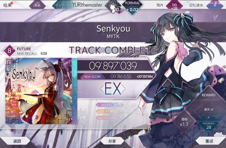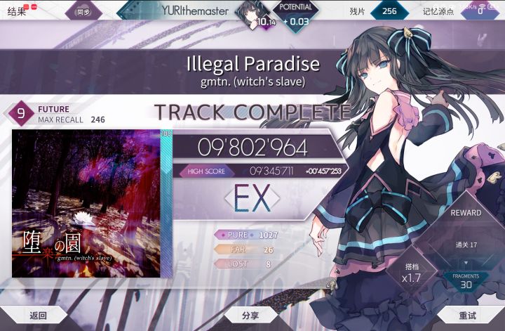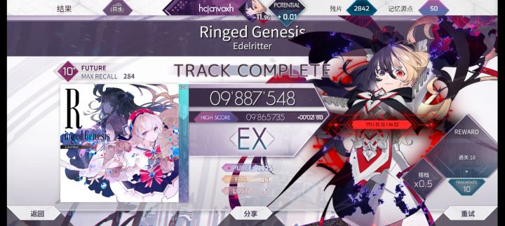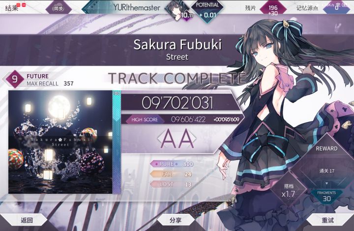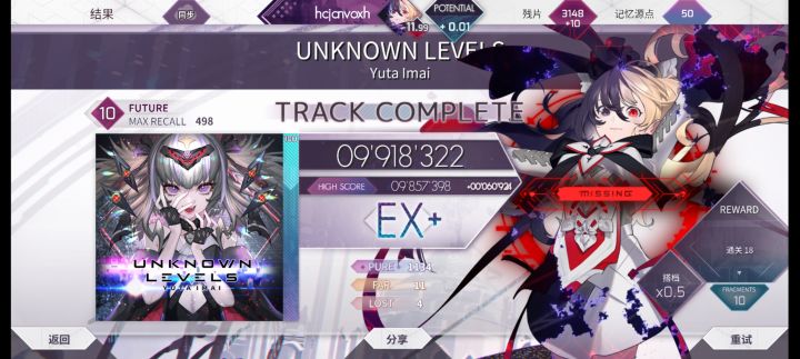 原定计划是一个月之前回归的,但是因为一些客观条件,我不能正式回归,现在可以了。开学之后这段时间我虽然TapTap用的不多,但音游还是会打的,主玩arc,随手打了点phi。 在Arcaea里,我把ptt推到了10.5,也有一些自己觉得打的好的成绩图,我来分别解说一下:图1图2应该是我目前的b1b2,两个9的EX+(这俩真水吧,尤其是樱吹雪,随手991好几次),还有一个EX+的9是失落文明,但是我