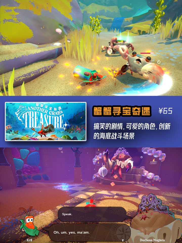 🎮末光🎮一款氛围感💯十足的动作💪冒险🔥游戏,色彩🎨艳丽,场景大气🌌磅礴,拥有电影🎬一般质感🎨的战斗系统⚔️。🦀蟹蟹寻宝奇遇🦀搞笑😂的剧情,可爱😍的角色,创新💡的海底战斗🌊场景,类魂🎲不只是暗黑🌑风,也可以很有爱❤️。💨风中行者💨《死亡细胞⚰️》团队打造,肉鸽🐦动作游戏,实在打不过😫还能召唤📢兄弟来帮忙。⚰️死亡之门⚰️一只小乌鸦🐦的冒险🚀之旅,画面🖼️优美,战斗💥激烈,尤其适合掌机🎮