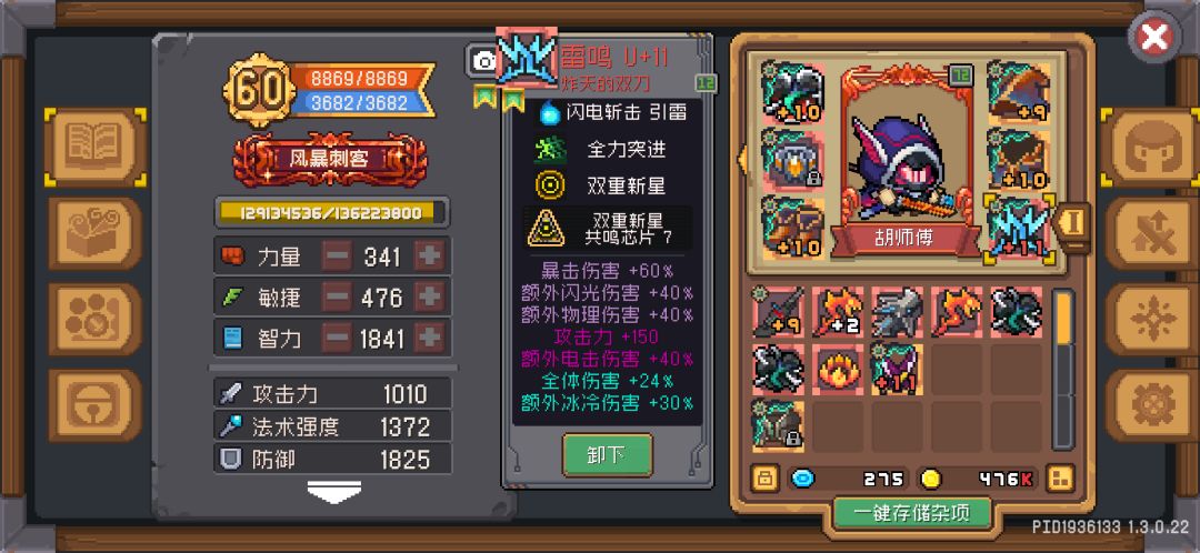风暴刺客带紫龙和电圈的雷神领域祝福时 我开电圈前我的面板(图2)额外雷伤是60 开了电圈触发雷神领域后面板(图3) 可以看到电圈的的移速已经加到面板上了 但雷神领域的额外电伤加成没有加在面板上 而且实际也没有得到雷神的加成 只是单单显示了动画而已…#元气骑士前传bug#风暴刺客#雷神领域#宠物