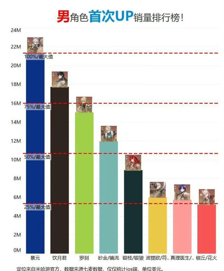 #今天游戏圈发生了啥 #游戏资讯 #资讯评论员 #崩坏星穹铁道 #飞宵 #崩铁飞宵 从排行榜中可以清晰地看到,景元以超过2400万美元的销量一马当先,达到了100%最大值,在众多男角色中脱颖而出,成为最受玩家欢迎的角色。饮月君紧随其后,其销量在1600 - 2000万美元之间,达到了75%最大值。罗刹的销量在1200 - 1600万美元,为50%最大值。砂金/镜流、银枝/银狼的销量分别在80