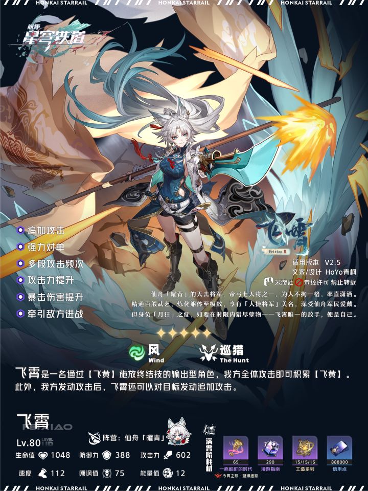 飞霄是一名风属性-巡猎命途角色,这位无虑、无悔、无敌的三无将军具备高频、稳定的追击输出能力;终结技能发动高强度的多段单体伤害,拥有极致的对单攻坚能力,突出巡猎的特色;飞霄与黄泉类似同样是有着独特的能量槽,通过自身及队友的攻击获得【飞黄】,以此累积点数以激活终结技;通过秘技产生的气旋,能在大世界无情卷走小怪一并拉入战斗进行统一清理;综合来看集爆发速度快、清杂、转火能力强于一体,是新一代的对单