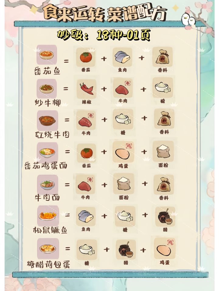 哈喽,7月最新的食来运转菜谱配方请查收~🌟7月18日菜谱只能解锁 普级和良级🌟7月19日更新妙级18种🌟7月21日更新珍级菜谱10种✔️每天完成开店任务,提高经验解锁后续菜谱。✔️本期已完结关注momo,不迷路~#游戏种草计划#桃源深处有人家#桃源深处有人家攻略#食来运转