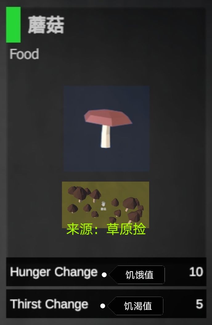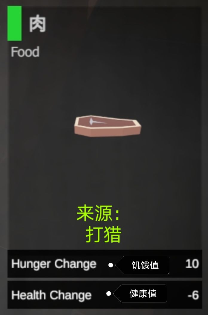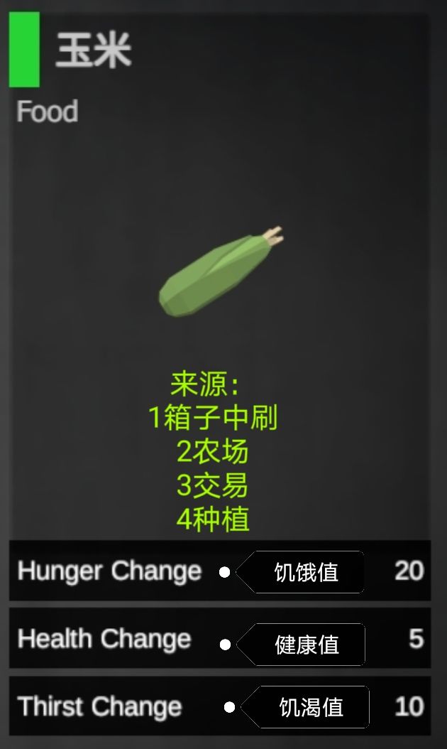 #启示录 #新手 #生存 #食物 食物是生存下来的条件,如果饥饿值或饥渴值为0,血量会时间增加而减少。食物基本属性都在图上农作物(玉米和南瓜)可以加少量血量生肉从动物上获得,吃了会减血,最好烤熟,熟肉加饥饿值最高饮料不可叠加,遇到直接就喝了,不然占位置水桶,初始500量,一次能消化30,有个水桶长时间不用担心水的问题。最大