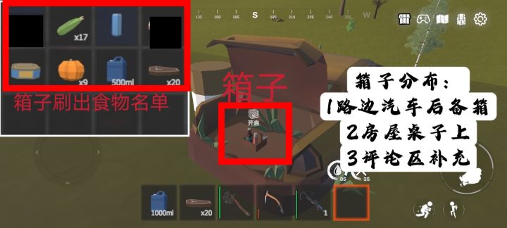 #启示录 #新手 #生存 #食物 刷食物物资,主要靠图中的箱子农作物在农场有种植的,旱地和大棚多,不过有僵尸游荡吃了玉米或南瓜,会得到种子可种植