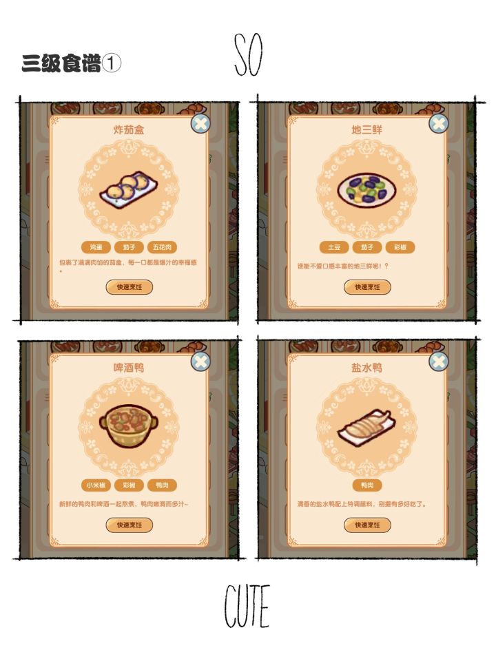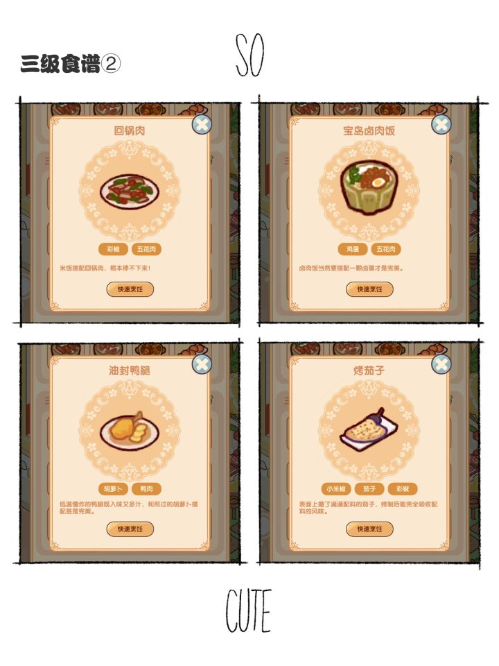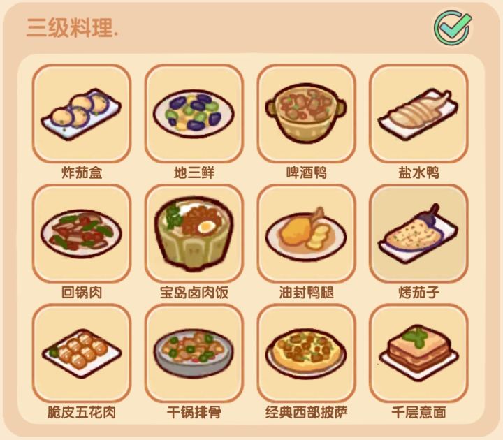 三级食谱 1、炸茄盒:茄子+鸡蛋+五花肉 2、地三鲜:土豆+茄子+彩椒 3、啤酒鸭:小米椒+彩椒+鸭肉 4、盐水鸭:鸭肉 5、回锅肉:彩椒+五花肉 6、卤肉饭:鸡蛋+五花肉 7、油封鸡腿:胡萝上+鸭肉 8、烤茄子:小米椒+茄子+彩椒9、脆皮五花肉:小米椒+五花肉 10、干锅排骨:小米椒+彩椒+土豆+排骨 11、经典西部披萨:土豆+彩椒+牛腩 12、千层意面:番茄+五花肉 #
