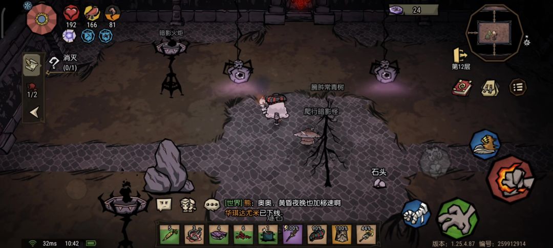 抓了一个蜘蛛小弟塞背包里杀了结果不算出不去了😅,退出重进也不行,吃生肉杀黑影也不行,都十二层了,难得运气好过了那构思双牛双眼,就这么恶心人#饥困荒野焕新 什么时候能修