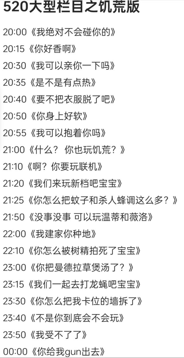 20:00《我绝对不会碰你的》20:15《你好香啊》20:30《我可以亲你一下吗》20:35《是不是有点热》20:40《要不把衣服脱了吧》20:50《你身上好软》20:55《我可以抱着你吗》21:00《什么? 你也玩饥荒?》21:10《啊?你要玩联机》21:20《我们来玩新档吧宝宝》21:25《你怎么把蚊子和杀人蜂调这么多?》21:50《没事没事 可以玩温蒂和薇洛》22:0