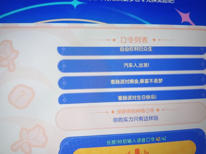 哈喽大家好我是香肠派对爱好者''夜斗努力ING''不少小伙伴都卡在八周年的口令上我帮大家集齐了所有的,普通话不标准的也可以让''豆包''帮你说哟!1万众一心 2现在照亮我们最黑暗的时刻吧 3我才是霸天虎们未来的领袖 4原始兽,变身 5巨无霸,变身 6我是大黄蜂,我来自赛伯坦 7威震天的字典里没有屈服,只有征服 8霸天虎,进攻! 9自由权利归众生 10让邪念彻底被焚烧吧 1
