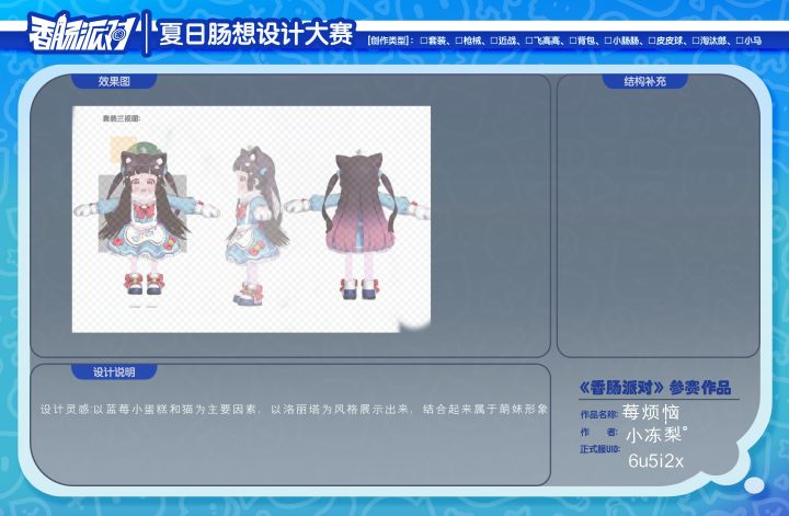 #香肠派对第四届设计大赛 设计作品名称: 莓烦恼作者: 小冻梨°正式服ID: 6u5i2x皮肤类型: 套装设计灵感: 蓝莓蛋糕和猫
