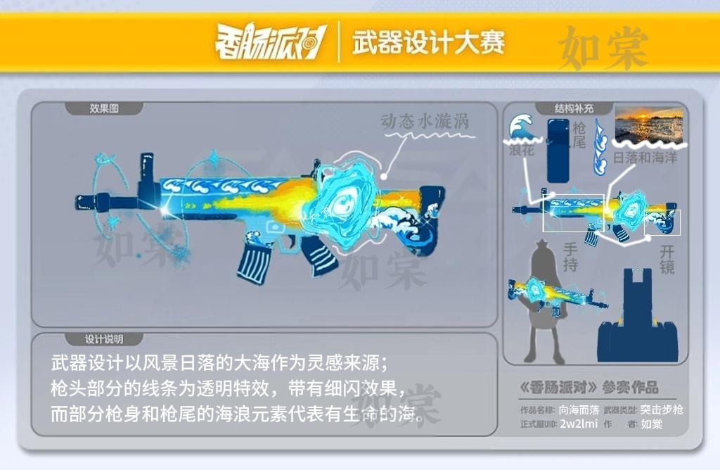 正式服id:2w2lmi作者:如棠设计作品名称:向海而落武器类型:突击步枪 SCAR-L设计灵感:一个风景照日落的大海,因为自身非常喜欢日落日出经常拍一些夕阳的照片,又很喜欢蓝色和大海。所以把这两个结合起来,产生灵感的创作的。补充:枪头环绕的蓝色线条和侧边的水漩涡都是流动的动态效果,枪上浪花为立体的#香肠派对第四届设计大赛