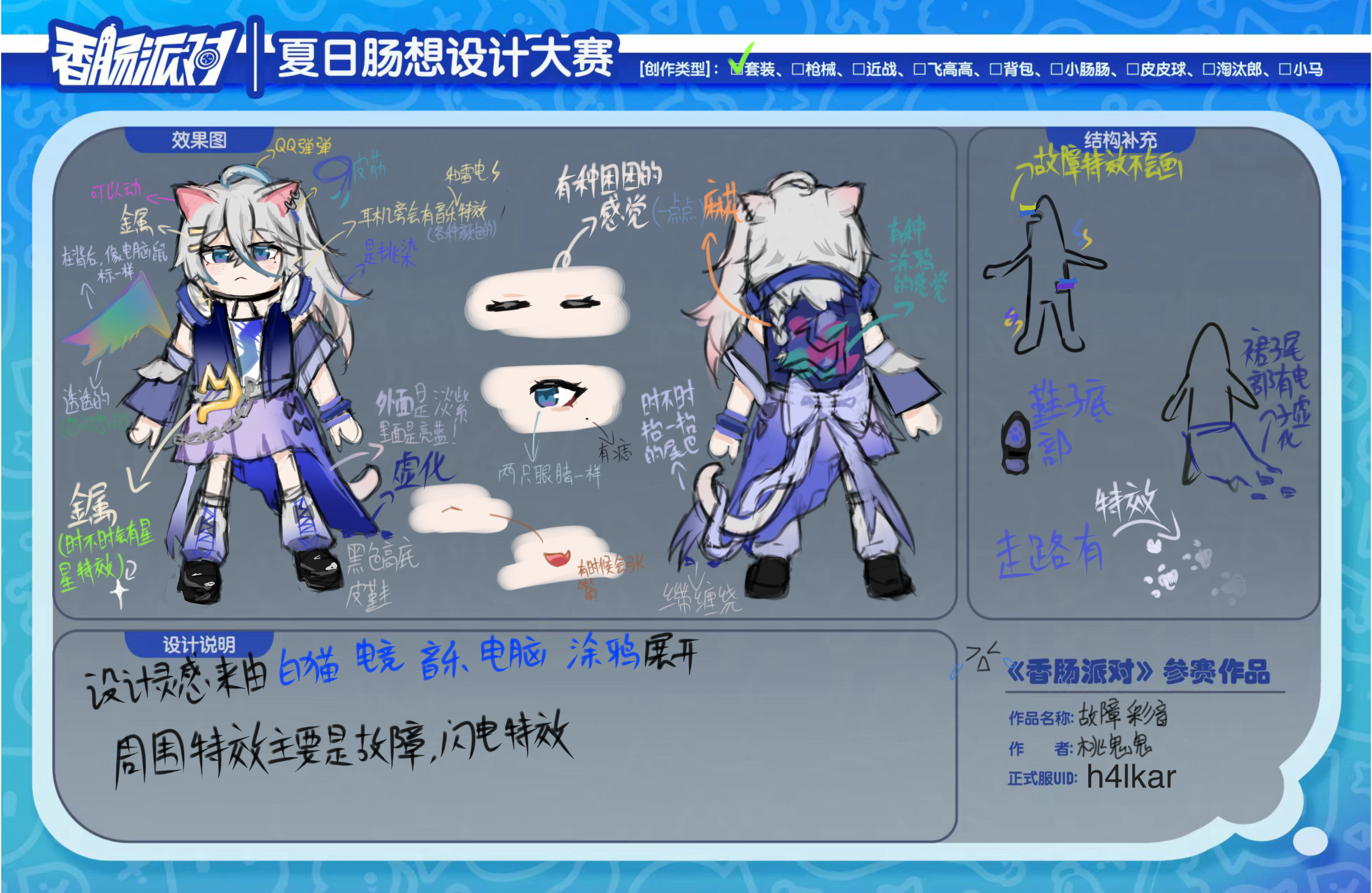 #香肠派对第四届设计大赛 第四届套装赛道+故障彩音 [正式服ID]:h4lkar [作者]:桃鬼鬼 [设计作品名称]:故障彩音 [皮肤类型]:套装 [设计灵感]:由,白猫,电竞,音乐,电脑,涂鸦几个词展开创作的