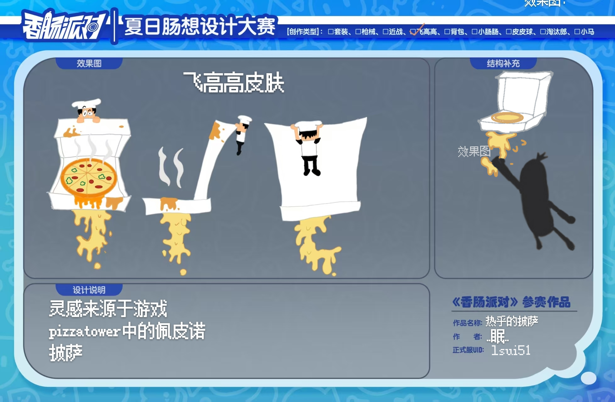 #香肠派对第四届设计大赛 [第四届玩具赛道] 创作名称:热乎的披萨正式服名称:..眠..lD:lsui51本主题采用了游戏pizza tower中的佩皮诺披萨