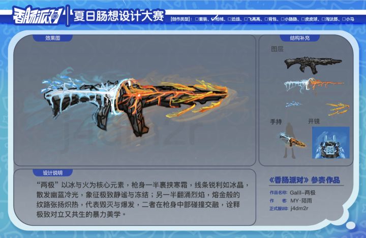 【正式服ID】:j4dm2r【作者】:MY•陌雨【设计作品名称】:两极【皮肤类型】:枪械【设计灵感】:“两极” 以冰与火为核心元素,枪身一半裹挟寒霜,线条锐利如冰晶,散发幽蓝冷光,象征极致静谧与冻结;另一半翻涌烈焰,熔金般的纹路张扬炽热,代表毁灭与爆发,二者在枪身中部碰撞交融,诠释极致对立又共生的暴力美学。 #香肠派对第四届设计大赛 #香肠派对 #香肠派对ss24 #香肠派对设计大赛#发现好游戏