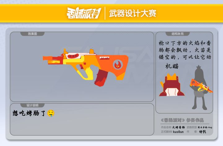 #香肠派对第三届设计大赛 #香肠派对设计大赛 #香肠派对 正式服ID:kus0un ,作者:译忛,设计作品名称:火烤香肠 ,枪械类型:突击步枪-Aug