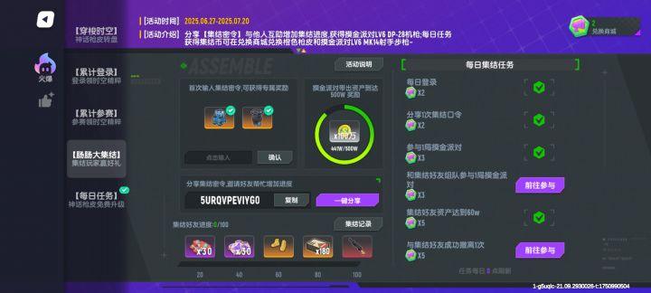 输入集合密令可获得金色装备 点击活动–在火爆界面–点击肠肠大集结–在图片画圈⭕处输入“5URQVOMJ2FXL”–即可领取两个金色装备。#香肠派对 #香肠派对66肠欢节