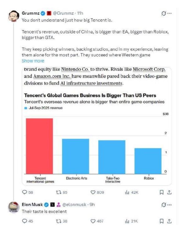 腾讯海外游戏收入领跑全球,马斯克盛赞其 “品味出众”