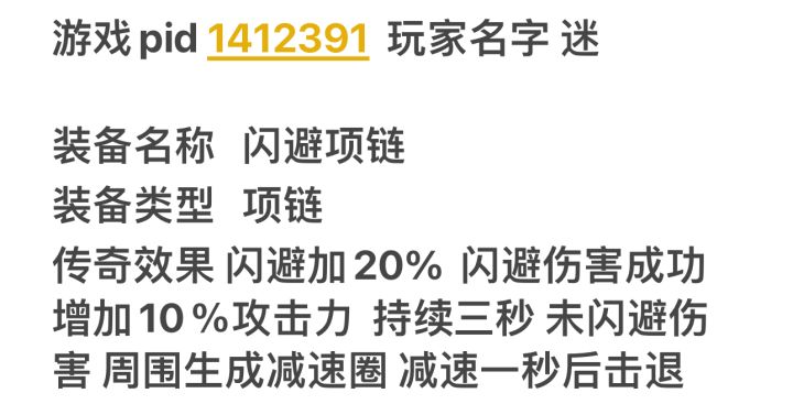 游戏pid 1412391 玩家名字 迷 #元气骑士前传 #骑士共振 装备名称 闪避项链装备类型 项链传奇效果 闪避加20% 闪避伤害成功 增加10%攻击力 持续三秒 未闪避伤害 周围生成减速圈 减速一秒后击退