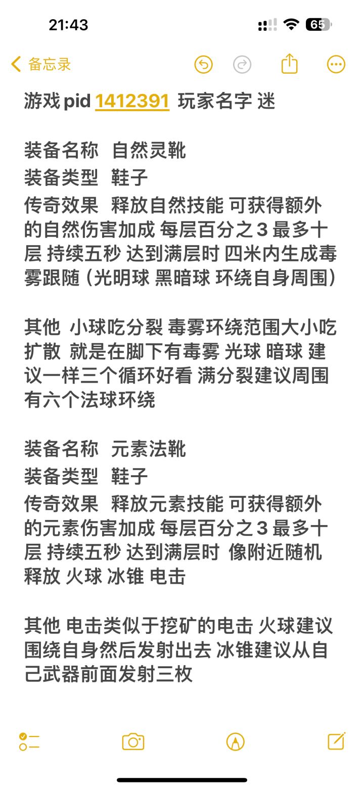 游戏pid 1412391 玩家名字 迷 #元气骑士前传 #骑士共振 装备名称 自然灵靴装备类型 鞋子传奇效果 释放自然技能 可获得额外的自然伤害加成 每层百分之3 最多十层 持续五秒 达到满层时 四米内生成毒雾跟随 (光明球 黑暗球 环绕自身周围)持续五秒其他 小球吃分裂 毒雾环绕范围大小吃扩散 就是在脚下有毒雾 光球 暗球 建议一样三个循环好看 满分裂建议周围有六个法球环绕 装备名称
