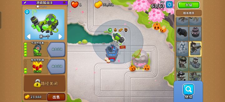 如图所示放置420刺钉工厂,或者用042迫击炮,一直放技能就行(今天buff有缩短技能cd,所以042迫击炮应该是作者的解题思路)今天的气球buff也是比较简单的,难度一般#气球塔防6 #高级挑战