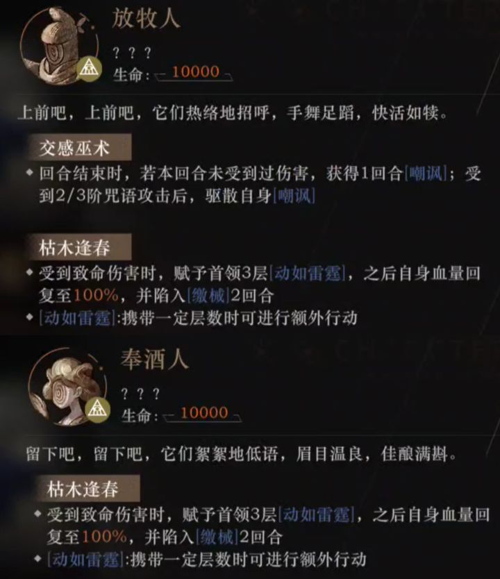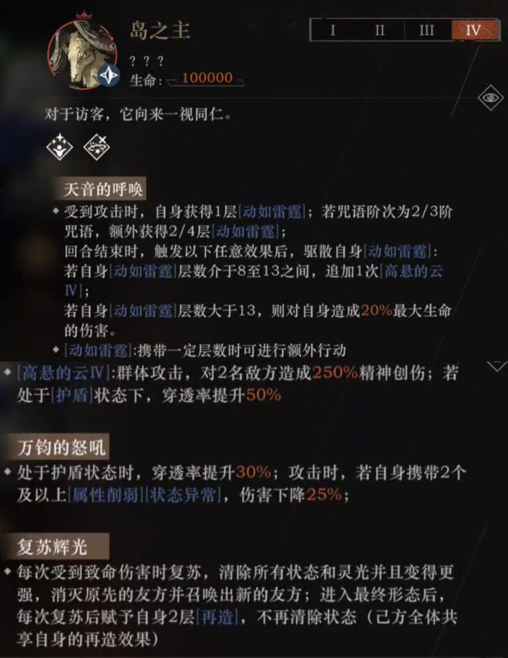 💫场地BUFF:[敌方]处于|岛主之盾]状态时,受创减兔+20%;[岛主之盾]被击破时,受创减免-60%,持续1回合[我方]自然灵感(即星木兽岩)角色攻击提升20%,现实防御与精神防御提升20%,最大生命提升20%[我方]精神创伤角色伤害提升15%;使用2/3阶咒语后,获得1层[激昂]💫敌方机制:详情见图片,这里只列出较为重要的机制。BOSS: 若自身|动如雷霆|层数介于8至13之间,