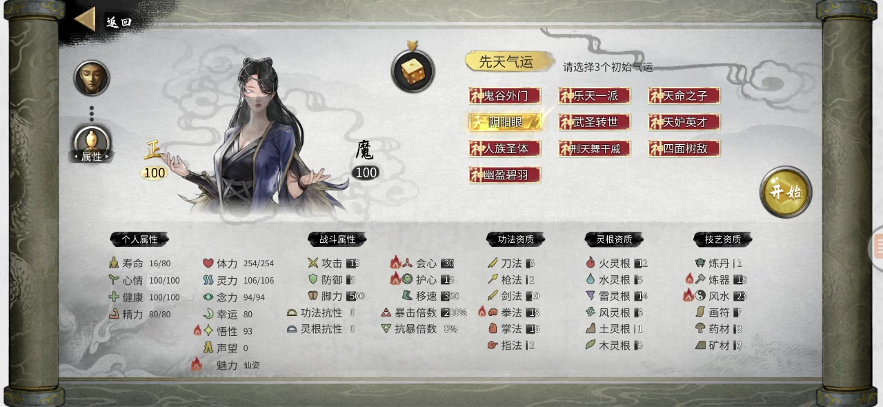 #鬼谷八荒手游 #鬼谷八荒先天气运 1.先要确认先天插件全部已打开(在主界面左下角里) 2.带上想要的先天结局衣服(要通关才有且只有五个) 3.在依次刷出想要的先天锁住并确保只选择了两个先天(先天只要锁住就游戏就有) 4.刷出想要的悟性后点一下衣服的先天就选择了三个先天开游戏就行了(想满幸运悟性注意事项我放评论区了)