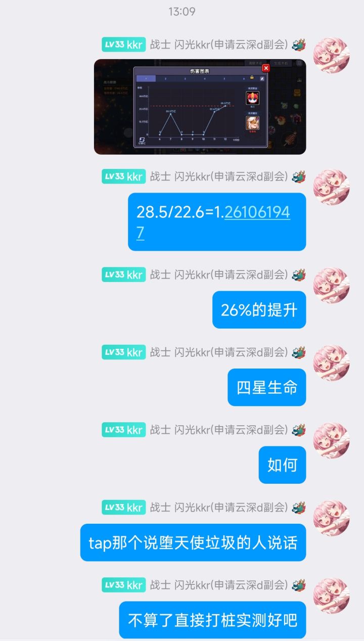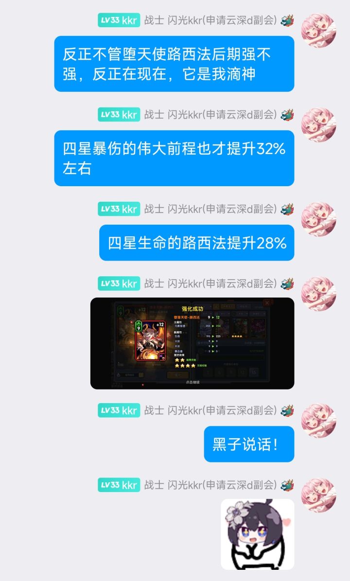 你来啊,继续张开嘴巴乱讲啊!你不会算不代表我不会算老虎魂卡那边我确实算错了,因为是乘法。就是说乘法提升那也就一点点,萌新没必要,实在想,那整个两星老虎就行。★★★分割线★★★路西法四星了,加上我运气不小心得到的四星切茜娅,10s叠满buff,平常打什么一样好用。✔四星路西法给20冷却,我把冷却龙息下了上了个此部位攻击的两星凯(相当于没有星级效果)一张路西法四星生命提升28%总伤害✔萌