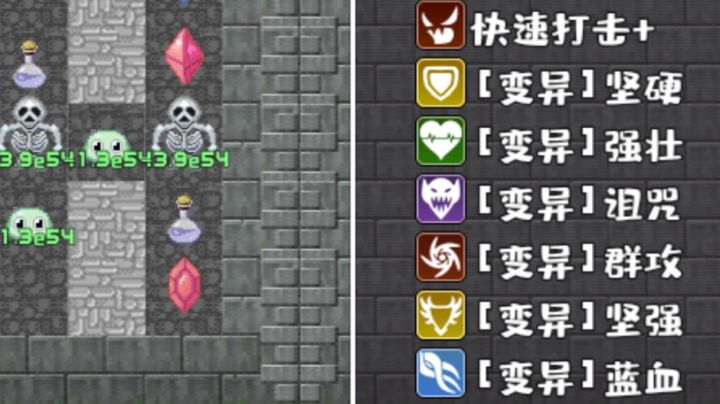 快速打击+先普攻x次,此后x回合不攻击x=[无尽层数/100+1]无尽尾数为9层的怪物专属技能该技能能被“无视技能”效果无视,且能与“无技能”同时出现,分类不明【变异】猛攻攻击增加0.5倍对方攻击值,防御减少0.5倍对方防御值可能会导致产生负数属性,某些吸取属性的技能吸取这些怪会使自己的属性也变成负数【变异】恢复受到普攻时,回复3%最大生命玩