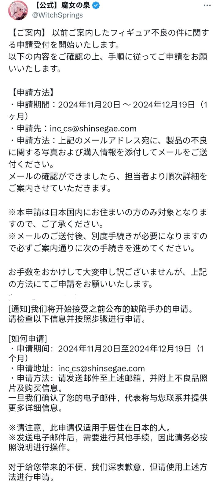 搬运下官方发的关于港版&日版限定版附属的问题手办处理公告,手办主要涂装问题就是脸上的红色纹样没有,新生产的手办补上了(不是受害者的可以看参考图4初版照片),需要更换的根据自己购买的版本去联系申请。港版【详情图2】,需要提供购买证明和收件信息(姓名电话地址)发邮件联系,联系邮件主题要填[魔女之泉R公仔更換],2025年2月28日截止。联系邮箱:purchasing02@justdan.com日