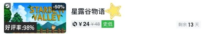 Steam夏促终于来了!首推《星露谷物语》直接史低24块,这价格买不了吃亏买不了上当!作为一个已经玩了300+小时的老农民,保证这游戏绝对适合喜欢农场经营与沉浸式场景体验的玩家。最上头的是游戏里各种隐藏剧情和彩蛋,比如刘易斯紫色短裤任务线,不同的做法会触发不同的剧情。最近还在魔岛modo上添加了“星露谷扩展”MOD,模组有多个可探索地图与NPC角色互动剧情,直接让游戏寿命翻倍。建议新手先原版通关一