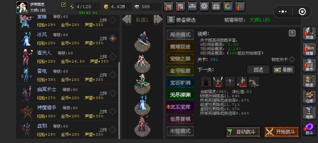 #魔法之路攻略 龙王2100之后血量暴增,在往上全是靠魔眼和永控来打输出了,不用指望角色本身有多少伤害(红银除外),阵容上面就按视频里的来可以做到全程二倍速,至于三倍速那就是看你手机处理器了,我这是很多年前的老手机了,骁龙778,银刃那个位置上谁都可以不挑,这里注意银刃的专属和刺客的专属,是这个游戏最卡的两个因素,龙王打不过的话把他俩下了就好了,其次就是电火花,如果你的手机处理器比我的骁龙778还