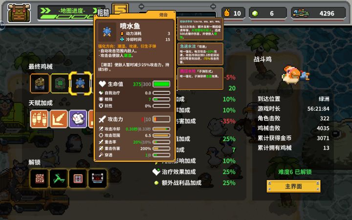 《鸡战绿洲》无疑是一款令人惊喜的作品。其剧情充满荒诞幽默却又暗藏深意,关卡设计巧妙地融合了策略与快节奏射击;操作手感流畅精准,每种武器都有独特的反馈节奏;武器库更是丰富得超乎想象,从经典霰弹到科幻轨道炮,搭配技能系统让战斗充满变数。然而,美中不足的是其UI界面。当前设计略显杂乱,图标辨识度不高,关键信息在激烈战斗中不易快速获取,部分菜单层级也稍显繁琐。若能加入深入的UI自定义选项——比如允许玩家