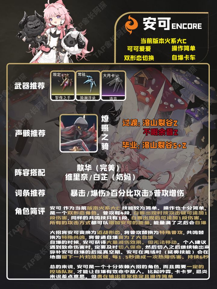 鸣潮五星T0级角色养成+毕业声骸一图流本期带来鸣潮五位常驻五星角色卡卡罗、维里奈、鉴心、安可、凌阳,限定UP角色-忌炎以及湮灭属性主角-暗主的毕业声骸推荐一图流攻略如有错误,欢迎指正。声骸可通过数据坞——合鸣图鉴 里的对应的声骸属性去点击查看不同的怪物,通过探测——可以直接找到对应的怪物,刷取对应声骸,建议数据坞等级到达15级后再考虑毕业金色声骸的刷取。#新游攻略先锋企划 #