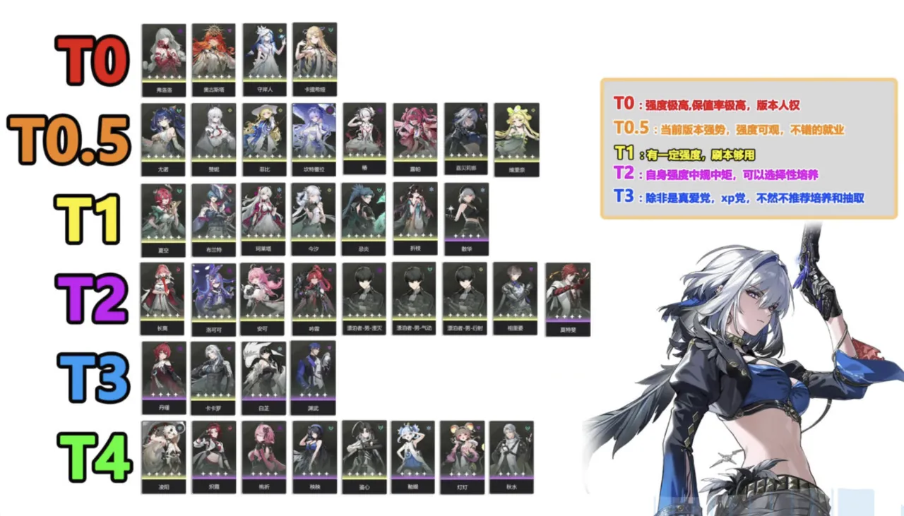2.7卡池刚上,新五星嘉贝莉娜出来就火了,虽然跟她一起复刻的还有露帕,但明显流水全靠嘉贝莉娜撑着,抽的人基本都是冲她去的,露帕这次复刻压根没什么水花。最近玩家社区里流传着一份2.7角色强度排行,里面T0级别的角色一共四位:弗洛洛、奥古斯塔、守岸人还有卡提希娅。这四位里三个都是版本顶级输出,就守岸人是顶级生存辅助,他是1.3版本的老角色了,但零命机制就很全,大招能回血还能给队友加暴击爆伤,要是之前没