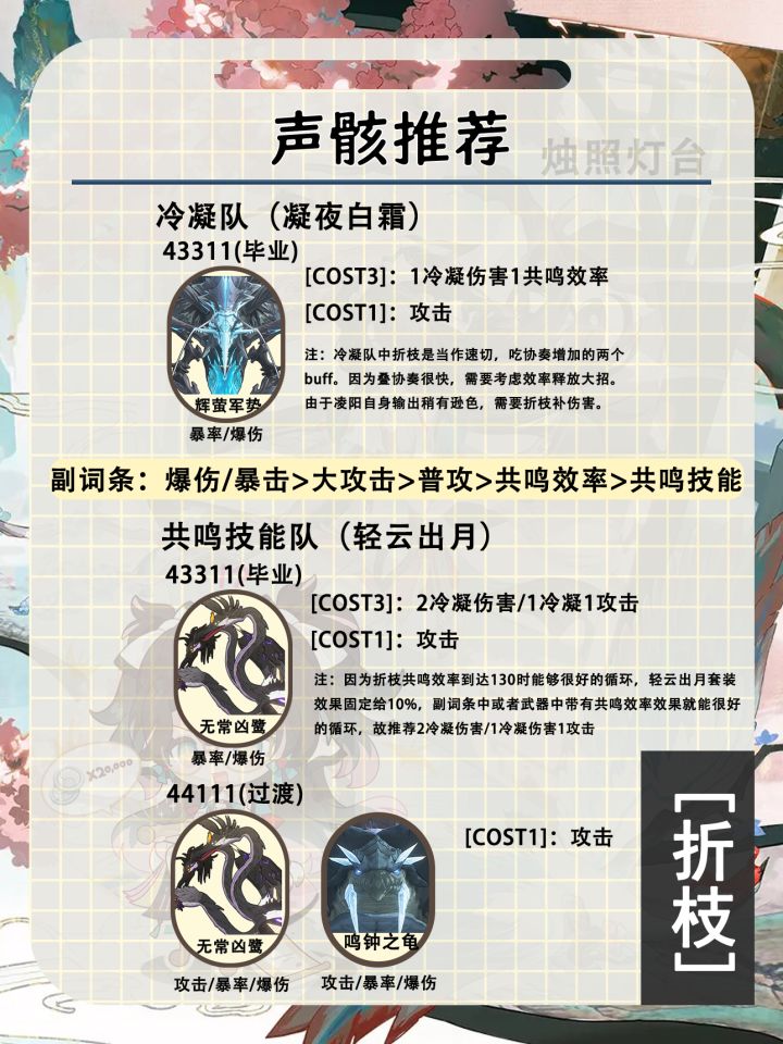 折枝属冷凝,作为一位辅助协同角色,具有不错的机制,就表明对方能够依靠共鸣解放进行后台输出的同时,也能够依靠不错的共鸣技能机制进行驻场输出。由于鸣潮的玩法机制上是依靠延奏部分合轴,那么就不难给折枝进行配队。折枝配队分为两种,一种为冰队,一种为主共鸣输出队。冰队现阶段输出代表为凌阳。凌阳自不必多说,驻场C。携带折枝后,其延奏的冷凝与E加伤都能吃到,再加上折枝协奏值更容易堆叠能做到不错的合轴。折枝对于
