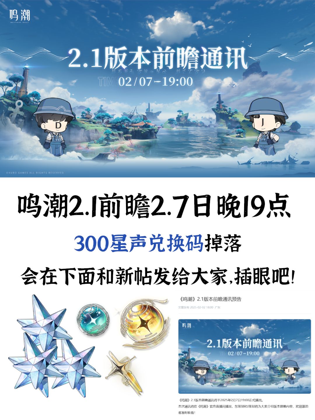 潮友们,鸣潮将会在2月7日晚19点进行2.1版本的前瞻直播,此次直播按照常理也会有星声兑换码掉落,大家可以插眼,到时候我挨个踢! 通过2.1版本签章的图片可以看出会有一片新区域新地图解锁,应该类似群岛之类的岛屿,这样通过地图探索就会得到一些资源去抽新角色,根据官方立绘发布顺序来看2.1版本差不多是菲比和布兰特两个新角色,有意抽取的潮友们可以准备好星声了~过两天轩儿也会及时把新角色材料发给大家~记得