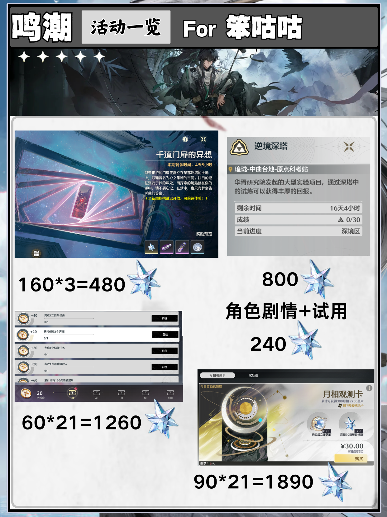 本篇攻略内容为大家总结鸣潮2.5版本上半活动和2.5上半星声(图二),弗洛洛一图流24日晚上会给大家出~注意:星声统计大世界探索、任务部分均为估算,请以实际游戏内获得数量为准-------------------------------------------------2.5上半卡池五星角色:弗洛洛&洛可可,四星角色:桃祈&灯灯&渊武2.5上半武器池五星:幽冥的忘忧章&悲喜剧,四星武器:
