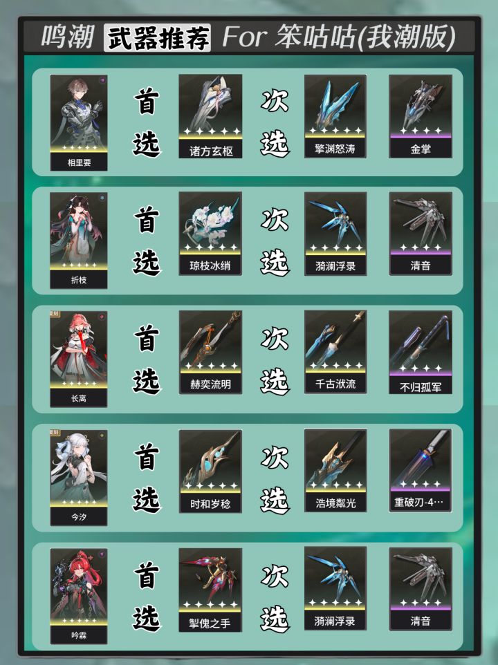 久等了各位潮男潮女,今天给大家带来新的攻略系列,鸣潮全角色武器推荐,该系列预计每增加4名新角色或者武器环境有较大变动时进行更新,今天是第一期。 首期为每位鸣潮角色推荐四把武器,按照优先级排序,以该角色最主要定位搭配武器,由于目前鸣潮武器池不够大,大部分角色仍然强烈推荐第一把武器,后三把武器如果大家有不同看法欢迎提出,轩儿也会逐步调优,后续武器推荐会考虑随武器数量增加而增加推荐武器数量。所有武器素材