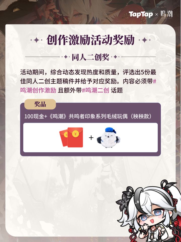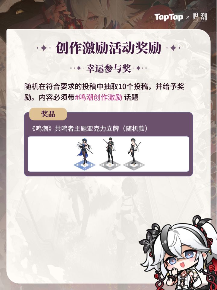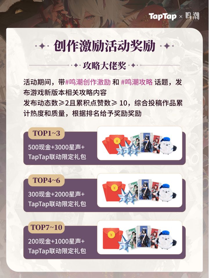 获奖公示传送门:https://www.taptap.cn/moment/640872824747065497——分割线——《鸣潮》1.4版本创作激励活动现已开启!参与投稿即有机会赢取创作现金和星声!活动时间:2024年11月14日-2025年1月1日🎁创作激励【攻略大佬奖】活动期间,带#鸣潮创作激励 和 #鸣潮攻略 话题,发布游戏新版本相关攻略内容发布动态数≥2且累积点赞数≥ 10